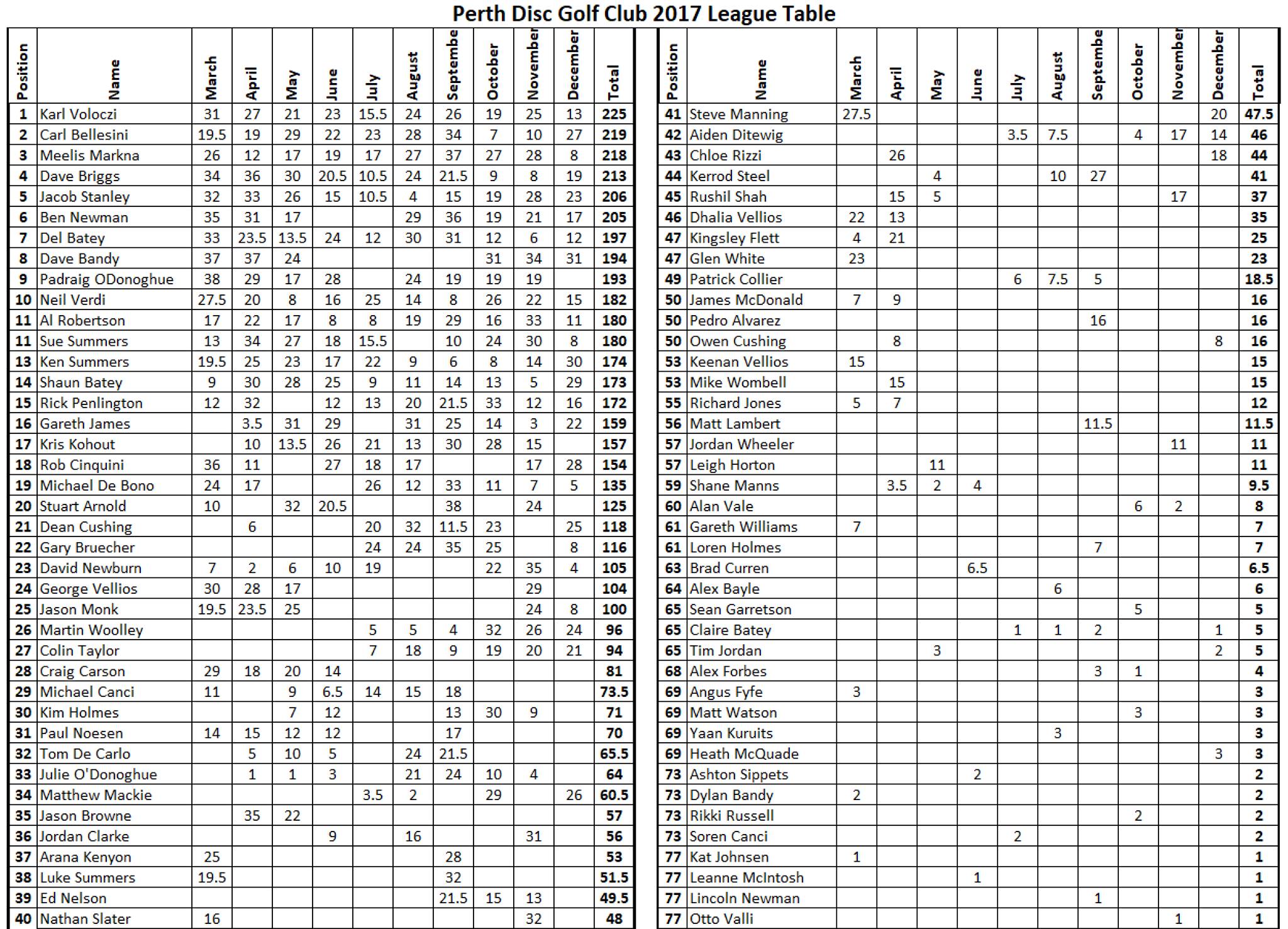 SportsPower Kingsway League Day results 2017 Posted on January 5, 2018August 18, 2024 by PDGC Admin SportsPower Kingsway League Day results, and overall ladder for the year! Well done to Karl Voloczi with the overall win for 2017, with Carl Bellisini 2nd, and Meelis Markna 3rd.